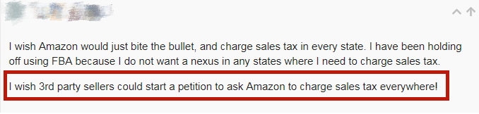 这位卖家还说道:“我希望所有的第三方卖家们可以开始请愿,要求亚马逊到处收取销售税!”