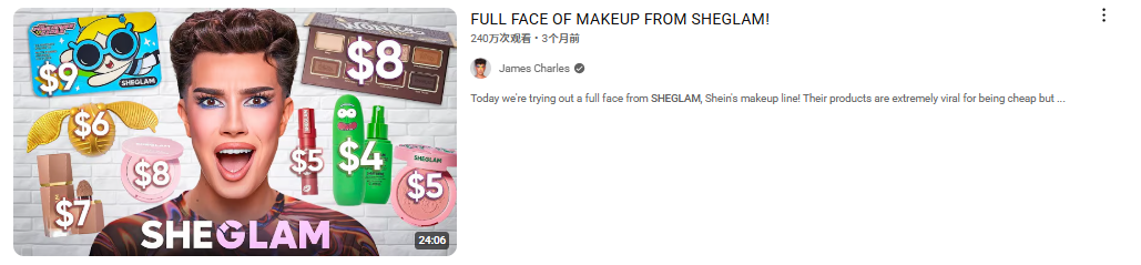 针对 “想了解更多再买” 的用户,YouTube 承担 “种草→说服” 的角色:顶流红人 James Charles 发布的时长 24 分钟的 “FULL FACE OF MAKEUP FROM SHEGLAM” 视频,营销效果十分突出,是品牌推广中很成功的案例。