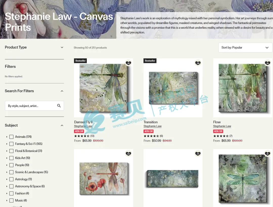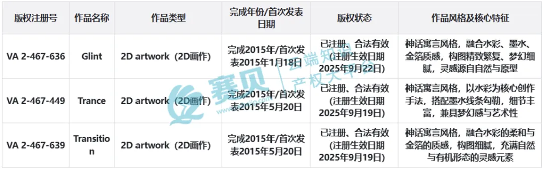 从赛贝TRO案件查询系统获悉,美国伊利诺伊州北区联邦法院受理一起重大版权侵权TRO案件,原告Stephanie Pui-Mun Law(美国知名视觉艺术家、插画师)于2026年4月13日委托Keith律所,起诉多名匿名被告通过线上平台销售侵权产品。原告作品以“神话、寓言、自然”为核心灵感,采用水彩、墨水、金箔融合的创作手法,风格精致繁复、梦幻细腻,涵盖3幅核心2D画作(Glint、Trance、Transition),涉案产品覆盖文创、家居、服饰等全品类。