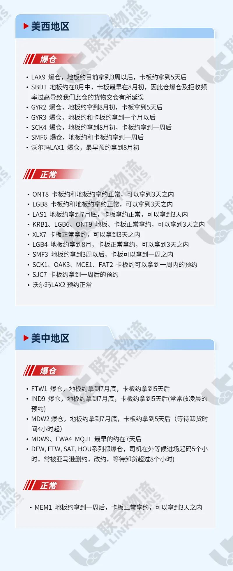 美国即将进入高温季,不单是对仓库作业有影响,对于卡派也会有隐患,市场上很多卡车维护状况不好,多是十几年的老车,高温长途会有爆胎等风险。选择卡派的卖家们,建议建仓时避开热门难预约仓库,选择美中或美东仓库去过渡这段时间。与您的物流服务商保持沟通,及时跟进动态。
