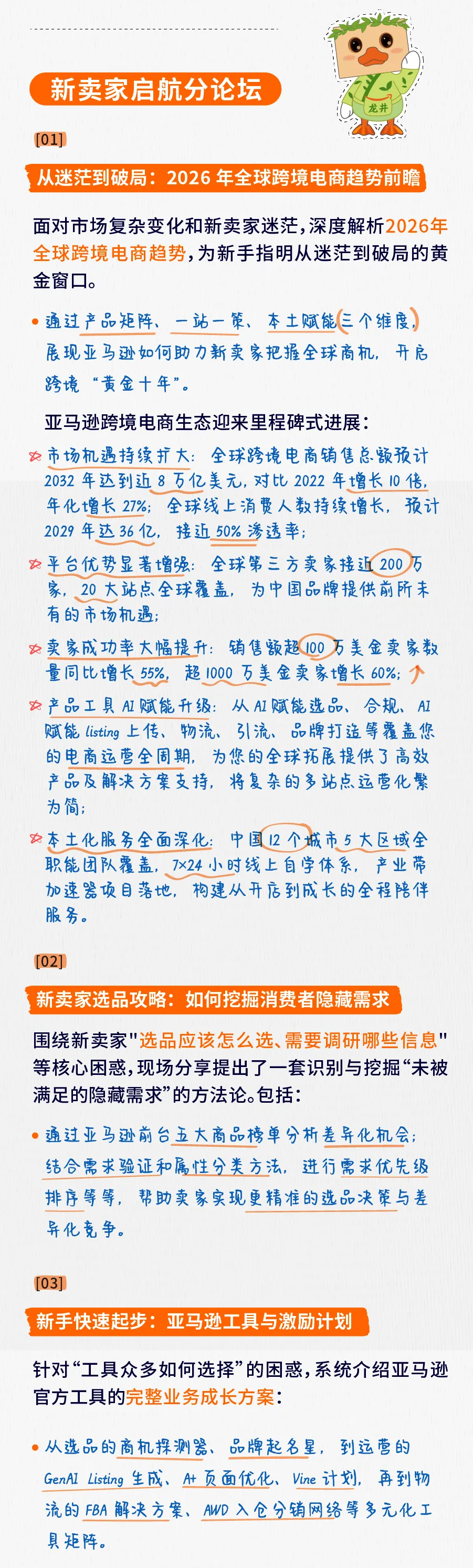 收藏!5分钟了解2025亚马逊全球开店跨境峰会重点内容!2025亚马逊全球开店跨境峰会顺利落下帷幕。这是我们又一次在一年之末,与整个行业一起完成的四天同行,再一次把跨境行业最核心的趋势、工具、理念与实践汇聚在同一个空间,同时也凝结了无数中国卖家和品牌对全球市场的共同思考。正如亚马逊全球副总裁、亚马逊全球开店全球业务负责人戴竫斐在主战略发布会上说到的:跨境电商的新十年,已经往“向优、向新、向全球”的方向发展。"出海之术" 必须与时俱进,"创新兼具韧性" 比任何时候都重要。本届峰会正是在这样的判断与方向下展开:以更前沿的洞察、更智能的工具、更务实的路径,为卖家提供迈向下一阶段增长的答案。以下是为您整理的精华内容回顾——关注公众号回复“加群”加入卖家交流群