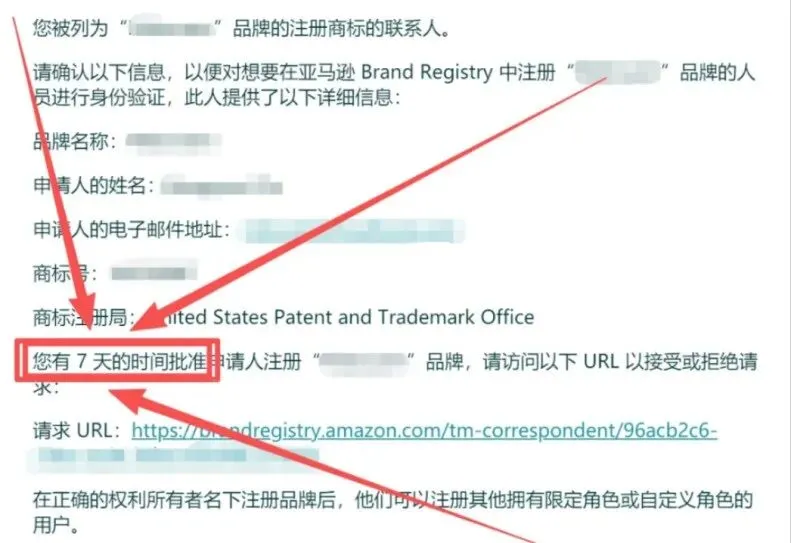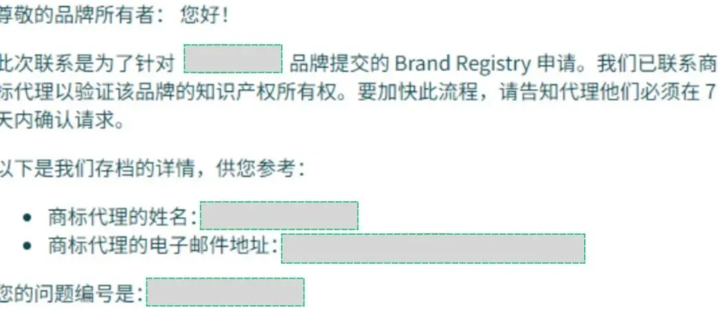 卖家这边收到的邮件只有一句提示:"我们已联系商标代理以验证该品牌的知识产权所有权,请告知代理他们必须在7天内确认请求。"