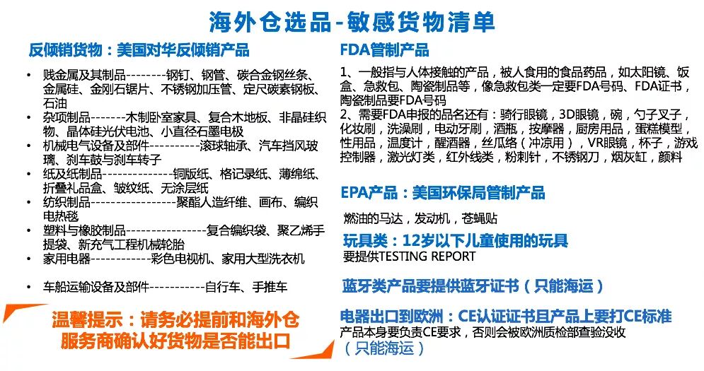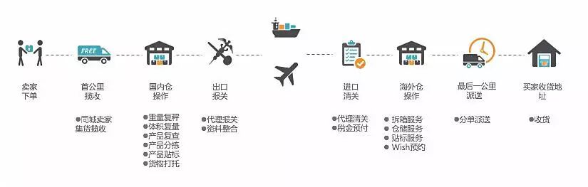 Let’s start! 海外仓运作流程 海外仓运作流程 我我们通常将海外仓的运作流程分为三步。 卖家→国内仓库;国际仓到仓运输;海外代理仓库→尾程派送→海外买家。 ⑴ 卖家→国内仓库 首先,卖家要将货物运输到海外仓服务商的国内集货仓中。 ⑵ 国际仓到仓运输(国内港到目的港) 工作人员会根据要求整合货物,通过空运或海运将货物运输到海外的代理仓库。 ⑶ 海外代理仓库→尾程派送→海外买家 一旦产品产生订单,境外海外仓工作人员会将货物挑拣给当地的物流人员,并由物流体系(最后一公里)将货物交付到海外买家手中。 海外仓服务商服务流程 海外仓服务商在整个流程中都扮演什么角色呢? 卖家下单:首先,卖家要在海外仓服务官网上下单,与海外仓服务商进行对接。 首公里揽收:对接完成后,海外仓服务商会到卖家处进行揽货,并将货物运输至海外仓集货仓 。 国内仓操作:在海外仓集货仓中,海外仓服务商工作人员会对货物进行一系列复查工作(重量复秤、体积复量、产品复查、产品分拣、产品贴标、货物打托)。 出口清关:完成复查工作后,工作人员会将货物装箱,进行出口报关,此时需要卖家提供公司材料、产品相关证书等报关资料。 进口清关:顺利报关运输至目的港后,还需要进行进口清关,海外仓服务商会预先支付一部分税金并代理清关。货物符合目的国清关规定后,则会被放行离港,并由海外仓服务商运输至海外仓仓库。 海外仓操作:货物抵达海外仓仓库后,海外仓工作人员会进行拆箱,并完成分拣上架工作(拆箱服务、仓储服务、贴标服务、Wish预约)。 尾程物流:一旦买家下单,则相关产品将由海外仓工作人员分拣给运输人员,并由当地的运输体系派送至买家手中。当然,尾程物流需要商家自行选择,建议商户按照当地的物流成本、配送距离和有效库存综合考虑,选择优的配送服务。 那么根据以上的流程,我们可以总结运作海外仓所需的成本类型,这里提供一个主流的成本计算公式,供各位参考。 海外仓货物总体成本=头程运费+税金+仓储及处理费+尾程运费 海外仓时间节点介绍 ⑴ 国内段时间点介绍 ⑵ 国外段时间点介绍 海外仓选品 海外仓推荐品类 ⑴ 符合出口规定的产品 加入海外仓的产品必须是符合出口规定和目的国进口规定的产品;若货物需要提供监管证书,请提供监管证书;坚决杜绝危险品。 ⑵ Wish Express热销品类 请参考每月Wish电商学院/公众号每月公布的WE月报,WE月报会每月公布近期的热销品类;消费电子类产品、个人配件、家居产品、美妆、服装一直是Wish Express海外仓销售额最多的五类产品;多SKU产品也选取热销SKU进行备货,并利用独立库存工具进行管理。 ⑶ 国内国外差距大的产品 体积大,超重的大件物品;国内快递无法送达的产品;国内直发运费成本高的产品,如:灯具、户外产品。 ⑷ 库存周转高且稳定出单的产品 这类产品销量稳定,提供海外仓备货可以提升用户体验,降低退款,进而获得更多市场份额,当然也要做好爆点预估,避免断货。此外不建议商家通过海外仓测试新品。 海外仓产品分类 ⑴ 普货类 符合国家出口规则、符合目的国进口规则、满足海运/空运条件的产品。 ⑵ 监管证书类 需要取得品牌、环保、食品药监(FDA)、电器(CE)等资质的产品。 ⑶ 危险品类 油、电、液体、气体。这类产品海外运输清关条件严苛,务必提前告知海外仓服务商是否可以备货海外仓。 敏感货物清单 建议商家认真研读以上敏感产品清单,与自己的Listing进行比对。若有在售的上述产品计划加入海外仓,请务必提前与海外仓服务商确定该产品是否可以跨境运输且符合目的国进口规定。 主要国家布局 美国仓库选址 美国东西部的人口比例为8:2,东西部价格和物流时效有明显的差异。美西仓的全境妥投时间约为5-8天,若商家想提供更高效的物流体验,建议在美东和美西各设置一个仓,则可以实现3天左右美国全境覆盖。 目前,主要海外仓服务商已在纽约、芝加哥、洛杉矶等地设置了海外仓。 美国头程物流 ⑴ 海运 货物从国内集货仓到通过海运方式运输至美西仓并上架,需要28-32个自然日。 货物从国内集货仓到通过海运方式运输至美东仓并上架,需要35-38个自然日。 ⑵ 空运 货物从国内仓集货仓到通过空运方式运输至美国仓(不分东西)并上架,需要7个自然日。 需要格外提醒卖家的是,旺季目的港拥堵可能性大。由于货量大,卡车联盟工人可能会有罢工的可能,如9月末的洛杉矶港。此外,9月份跨境端飞机排仓难,普通卖家可能难以获取足够的空运仓位。 美国尾程物流 美国的尾程物流主要包含邮政和商业快递体系。 中国卖家主要选择的美国邮政服务是USPS,USPS是美国万国邮联成员,有美国最大的民用车队,优势为配送范围广、中小件性价比高。Wish卖家常用的USPS产品有First-class packages/Priority Mail。 中国卖家主要选择的商业快递多是Fedex和UPS。 Fedex的业务包括地面快递、重型货运运送,优势为1-10lb以内的快递性价比高。 UPS是美国最大的包裹承运商和包裹运送公司,优势为时效快,一般2-6个工作日送达。 鉴于每个海外仓服务商与当地的物流服务商合作程度不一,建议根据商家主动向海外仓服务商获取海外仓尾程物流报价,并根据自己的货物重量和数量以及配送范围综合考虑选择哪种尾程物流产品。 英国仓库选址 英国国土面积不大,当地物流多样且发到,可