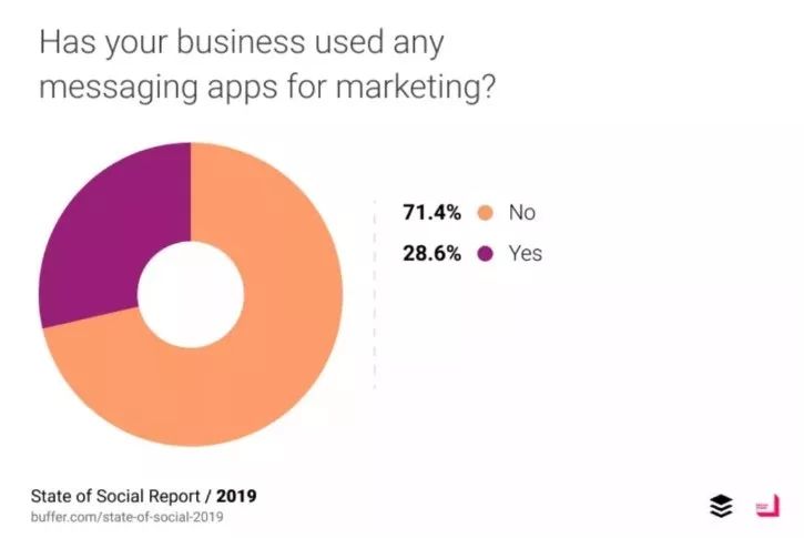 近几年,随着越来越多的人开始选择通过一对一或者小群聊的聊天app进行沟通和交流,社交媒体开始变得越来越私人化。但是尽管这些平台的人气与日俱增,但是仍有71%的品牌并没有把它们囊括进自己的营销策略中。而且仍有50%的营销者表示自己在未来也并不会通过这些聊天app进行营销。