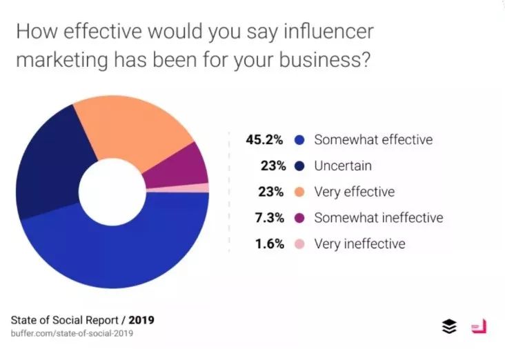 调查中,37%的营销者表示他们的企业开始将网红营销纳入整体的营销策略中。而对于网红营销的效用,68%的人表示这种手段十分有效;但也有23%的人表示他们并不能十分确定网红营销的影响是正面还是负面的。在未来,88%的品牌表示自己会继续使用网红进行营销宣传。