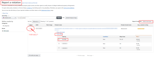 通过后台品牌备案的Report a violation 进行投诉时,在页面勾选时一定要谨慎,不要勾选到整个listing。点击listing下面有个all offers , 要勾选跟卖狗的店铺。