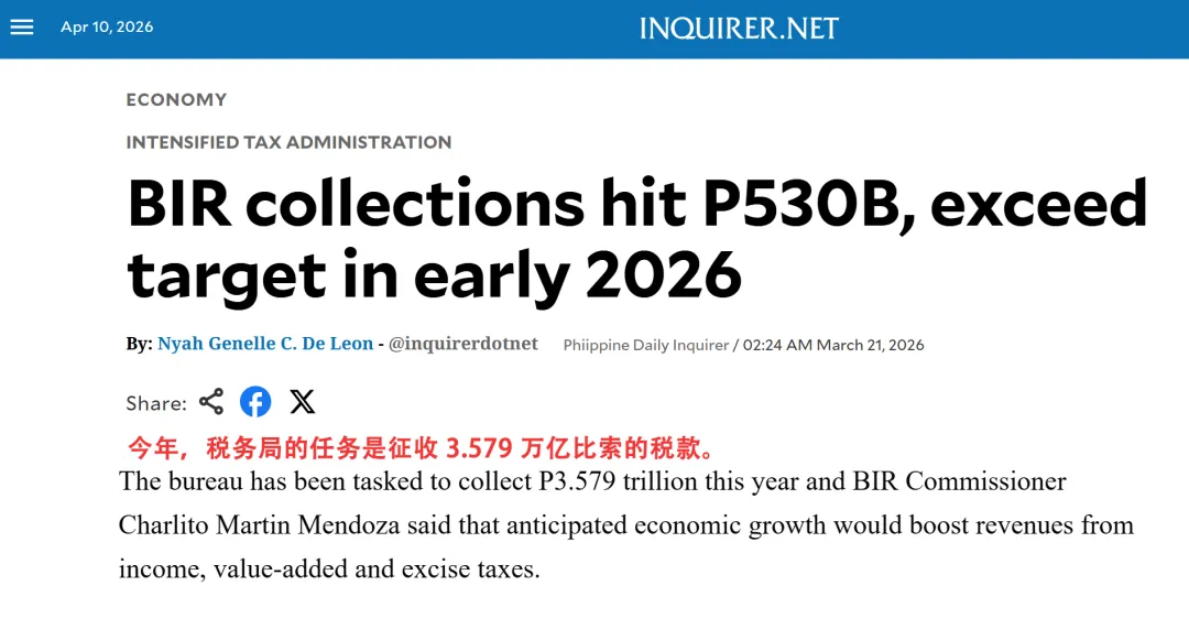 外媒报道,2025年,菲律宾国税局没能完成3.2万亿比索的征税目标,今年的任务更艰巨,2026年该部门计划征收3.579万亿比索的税款,其中数字服务增值税就要扛下210亿比索。可见,征税的镰刀挥舞起来不会手软。