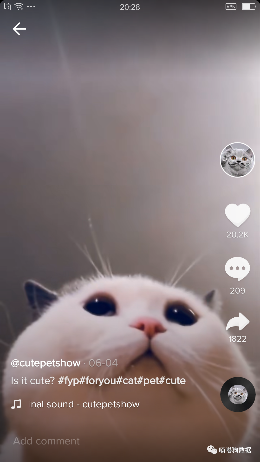 做抖音,选好领域很关键。选择受众比较广的领域,确实更容易把账号做起来。最简单的例子就是宠物领域。因为宠物可谓是老少皆宜,大部分人都对可爱的宠物没有任何抵抗力。 抖音的宠物领域一共有12个粉丝超过1000万的账号,粉丝超过100万的账号更是数不胜数。这就说明,宠物领域的竞争还是比较激烈的。做得好不如做得早,后来人想挤进去就很难了。 而且纵观粉丝量排名前几的宠物领域账号,视频基本上都有设置剧情,加入配音。视频制作的成本并没有大家想象中的那么低,花费大成本又不一定能保证结果,相信大家都会有所顾虑。 相比之下,抖音海外版TikTok的内容还有所欠缺,新账号完全有可能在宠物领域占领一席之地。 /01/ 靠一款视频爆红,进而带动整个账号的推荐量,这是多少创作者的梦想。然而事实往往并不如意,单纯靠量的累积,不一定能促成爆款的诞生。我们看到的爆款视频表面的风光,却没有发掘爆款视频背后的真实内核。 7月3日的嘀嗒狗最新数据显示,一个昵称为“Cutepetshow”的账号一天涨粉26万,点赞新增230万。嗅觉比较灵敏的人肯定有所发觉:出现爆款视频了。 Cutepetshow这个账号归属于宠物领域,主要做的是萌宠视频的展示。账号的第一个视频发布于6月4日,点赞量2万,评论量209。这个数据对于新号来说,已经很优秀了。整个6月份,Cutepetshow的数据都比较稳定。 直到7月3日,爆款视频出现了。单个视频收获了170万点赞,12700条评论。视频的主要内容是:面对透明胶带的阻碍,每只猫咪的不同反应。有的猫咪迎面撞上了透明胶带,有的喵咪直接原地起跳飞跃过去。 那么问题来了,为什么这个视频会走红呢? 其实,视频成为爆款并非偶然,Cutepetshow的视频一直都遵循以下五点。 /02/ 视频中主体多样化 TikTok遵从内容为王的原则,只要视频有看点,就有机会成为爆款。新号需要在短时间内呈现出尽可能多的爆点,这样才能留住观众。同一种创意,由不同主体去表达,可以持续输出爆点。账号初期不用过于在意个人IP的建立,粉丝和流量才是王道。 利用道具展示创意 创意往往来源于道具。给宠物穿上奇装怪服,往往会收获很高的关注。有些视频里,宠物会戴眼镜,戴项链,效果也不错。值得一提的是,食物也属于道具。宠物吃龙虾的视频,让观众不禁感叹,活得不如一只猫。 文案辅助剧情展开 宠物不会说话,但是我们可以通过文案,将宠物拟人化。再加上剧情的设计,视频的内容也会变得生动有趣。所以我们可以看到,有些视频里,主人会和宠物对话。宠物的叫声,以及肢体反应会让观众产生联想,代入感很强。 背景音乐尽量卡点 一个好的视频,画面,文案,背景音乐缺一不可。想表现可爱的主题,就得好好运用背景音乐的卡点。宠物的每一个动作都可以卡点,都可以持续触及观众内心最柔软的地方。做好卡点,会让视频有更高的完播率。 回复评论增加互动 众所周知的是,评论量是衡量视频的一大指标。所以我们可以在视频底下做引导,让观众留言,或者回复观众的留言。人都有认可欲,你回复了留言后,自然会收获观众的好感,进而留住粉丝。 说在最后 嘀嗒狗专注于tiktok生态商业化研究,依托专业的大数据挖掘和分析,发现更具商业潜力的网红,跟踪最新的创意广告投放。 我们目前正在对各领域的网红进行数据跟踪和研究,解析不同博主爆红的独特方法。在过去的几个月中,我们参与了多个社群的tiktok大航海行动,结识很多百万粉丝的TikTok的创作者。 团队也运营了数百万的矩阵账号,我们总结了行之有效的TikTok的运营经验在嘀嗒狗指南中: 1、手机网络设置 2、TikTok安装注册指南 3、TikTok账号运营指导 添加我的微信:xiievil,获取嘀嗒狗独家的tiktok运营指南,我们欢迎所有想要乘着TikTok流量巨浪扬帆出海的小伙伴,一起研究,资源共享。 //END 来源: 作者 | 嘀嗒狗 图片 | TikTok