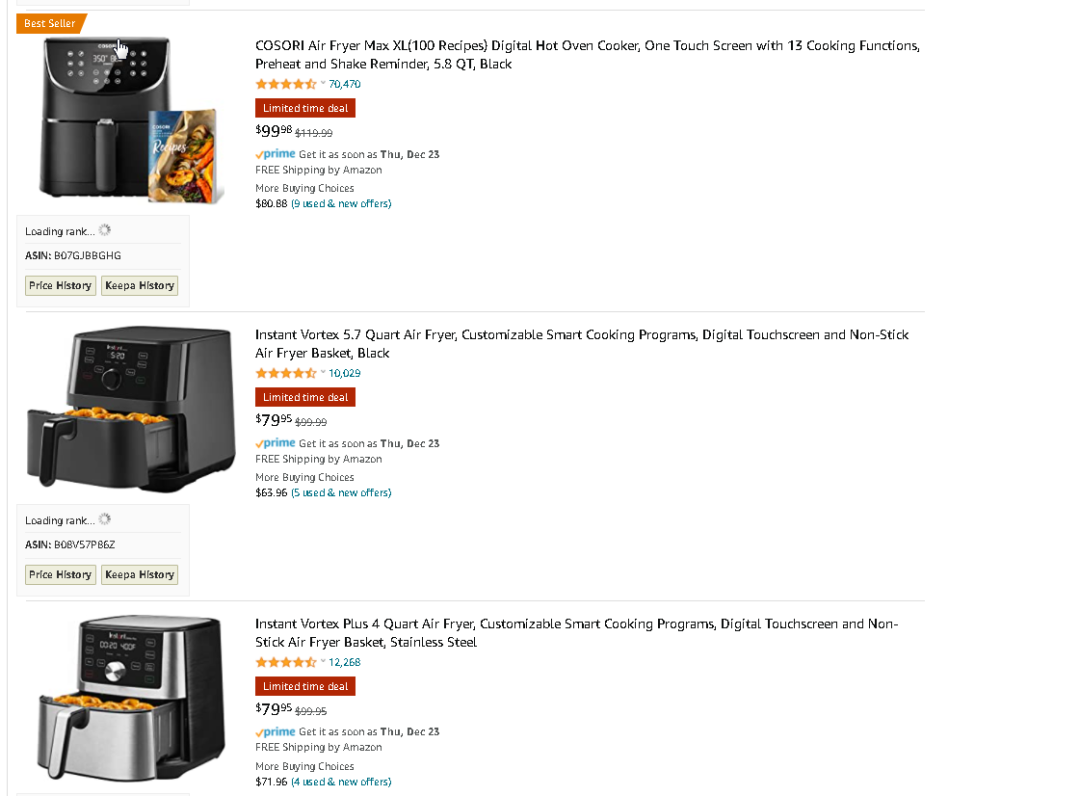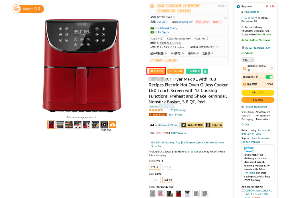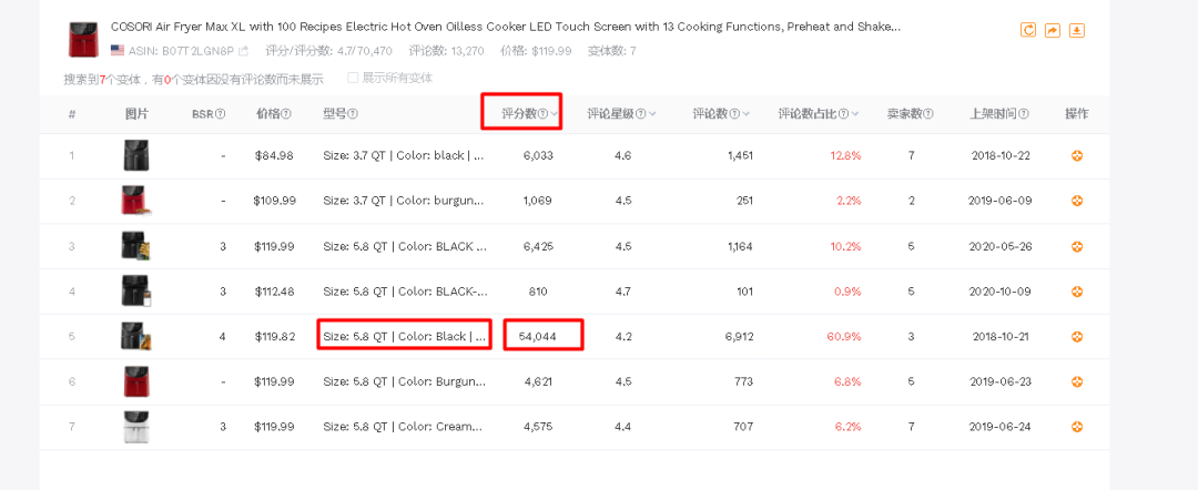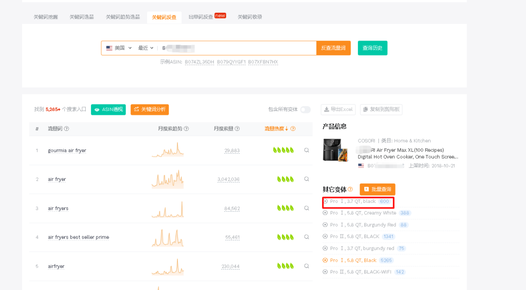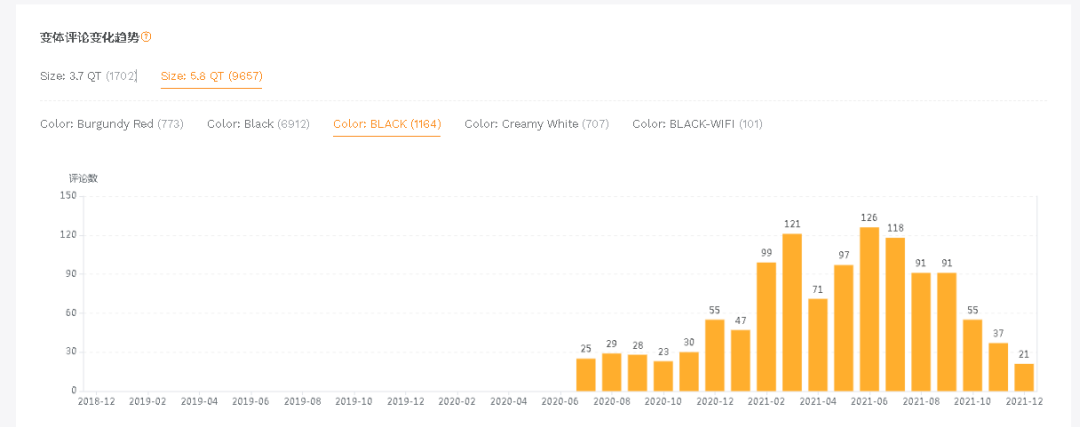 很多时候我们选品会看到一些品不错,但是变体也有好几个。我们测品肯定不会每个颜色、尺寸或者款式都发。所以,要先找竞品销量好的变体作为参考来测品。那么,我们今天的主题是如何快速判断竞品Listing 哪个变体卖得好。1.竞品核心流量大词搜索默认显示的变体是销量好的变体亚马逊变体搜索排序规则是哪个变体在某个关键词下转化越好,那么它就会默认显示在该词的搜索结果页面上。找到产品的核心流量大词,注意一定要是核心流量大词。如果是小词,可能某些变体销量不好,但是某些小词表现好,会形成误判。所有要要流量大,相关性强大词。然后在亚马逊前台搜索框输入核心流量大词, 默认显示的那个变体就是销量好的变体。如下图,是我们用核心关键词air fry 搜索的结果 ,这几个产品都有变体,但是销量较好的就是默认显示的几个。注意事项:广告位的搜索结果不能参考,因为广告位是投哪个产品,展示哪个产品结果。当某个变体销量好时,肯定它的流量多,流量多那么就流量词收录多。这样的话,我们可以通过软件反查各个变体的流量词。 比如我们用卖家精灵的关键词反查功能,输入竞品任意一个变体的ASIN ,反查流量词后就会看到各个变体的流量词收录数量。Pro Ⅰ, 5.8 QT, Creamy White 388Pro Ⅰ, 5.8 QT, Burgundy Red 88Pro Ⅱ, 5.8 QT, BLACK 1341Pro Ⅰ, 3.7 QT, burgundy red 75Pro Ⅰ, 5.8 QT, Black 5265Pro Ⅱ, 5.8 QT, BLACK-WIFI 142明显可以看到是 Pro Ⅰ, 5.8 QT, Black 5265 这个流量词最多。所以在同一条listing中,收录词较多的销量是较好的。但是,根据我们经验,有些产品虽然收录的词比较少,但是他核心大词都比较靠前,销量好。所以,我们还要再用最的核心流量词搜索看默认显示是否是 Pro Ⅰ, 3.7 QT, black 600 去进一步检验和确认是否这个变体是销量最好的。这样比较稳妥。3.评论总量多和评论月增长数多的变体销量好(最准确的方法)评论总数多的变体历史销量总和高,变体月增加数量多的当月销量较高。我们知道亚马逊当前的留评率在1%-5%之间。根据评论数的多少,可以大致判断出来销量多少。这个可以手动统计分析,但是工作较大。如果没那么多时间,可以借助卖家精灵来实现各个变体评论总量和各个变体月评论增长数的统计分析的。如图所示,进入竞品listing 界面。加载卖家精灵插件后 ,点击评论分析,大概过3--5分钟评论分析完成评论总数:Pro Ⅰ, 5.8 QT, Black 54044个评论,评论总数最多。说明其历史销量总和最大。各个变体每月评论增加量(该品为双变体,总计10个变体):① Style: Pro Ⅰ | Size: 5.8 QT | Color: Black ,2021年09-12月评论增加量分别为:146,186,134,89② Style: Pro Ⅰ | Size: 5.8 QT | Color: BLACK,2021年09-12月评论增加量分别为:91,55,37,21③ Style: Pro Ⅰ | Size: 5.8 QT | Color: Burgundy Red ,2021年09-12月评论增加量分别为:21,28,20,15④Style: Pro Ⅰ | Size: 3.7 QT | Color: Black ,2021年09-12月评论增加量分别为:21,19,18,6该品为双变体,总共算下来10个子体,你可以自行借助卖家精灵逐一判断,在此不在一一列举。经过10个对比,发现 ① Style: Pro Ⅰ | Size: 5.8 QT | Color: Black 这个变体是最近四个月每个月评论数增加最多的变体。大家可以三个方法对比着试试,看哪个好用,也可以互相验证判断是否准确哦。好了,今天的分享就到这里了。如果大家对亚马逊子账号有更深的见解或者想法,欢迎在知识星球留言讨论哦!跨境路上,有你有我,我们一起加油!(备注:文中图片全部来源于卖家精灵,并经其授权使用)