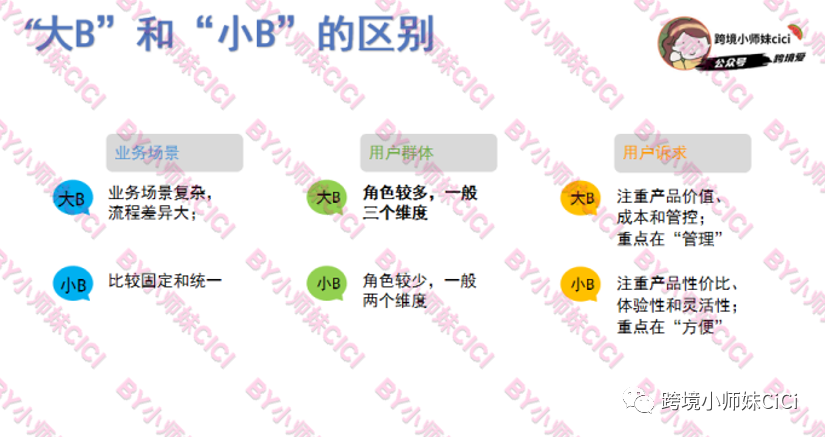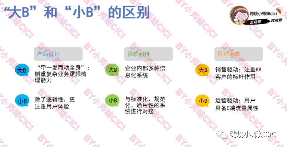 首先说一下对“大B”和“小B”的定义,不同行业不同业态,对规模大小的定义不同。比如以前我做B2B业务员的时候3C配件做“小B产品”,客户公司人数大多在“20人以下”,所以对于我们来说,20人以上就算是规模比较大的客户了;如果是“大B产品”,都是很流程化的大公司。