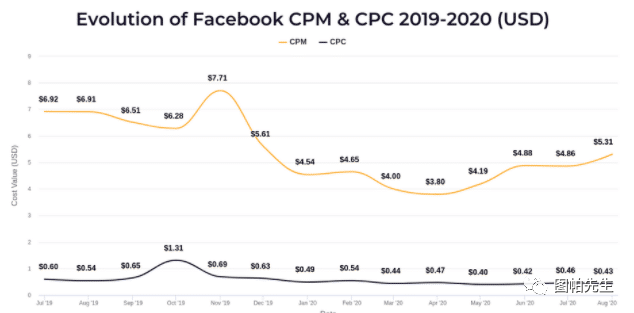 根据报告,Facebook上的平均点击率继续保持在3%左右。在2020年6月,它飙升至3.41%,但随后几个月自然回落到3%。这个我觉得还算正常,因为疫情让人们的活动很多都转移到网上,社交媒体成为信息的主要来源。因此,点击率也受到影响。