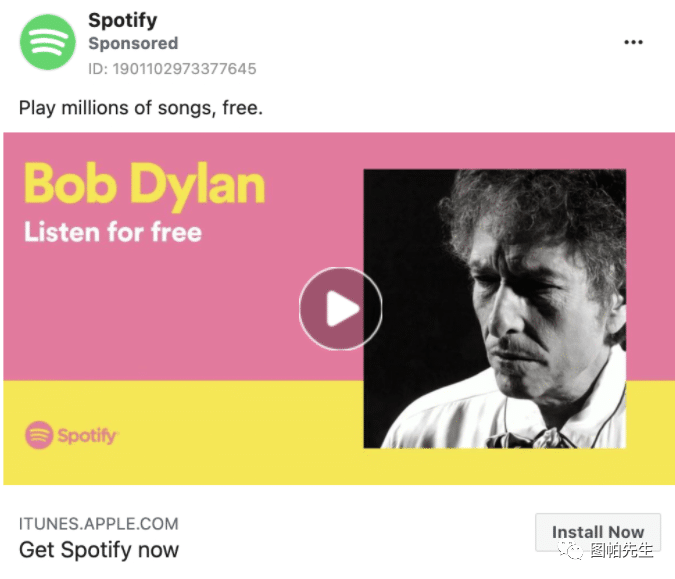 例如,表明价格优势是吸引眼球的好方法。下面的Spotify,在广告图片和文案中都使用了 "Free "一词,