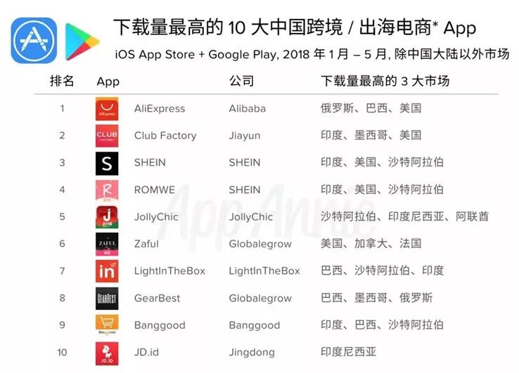 近日,移动应用数据公司AppAnnie的报告显示,2018年的前5个月,在海外市场表现最好的10款中国跨境/出海电商应用中,Club Factory、SHEIN、ROMWE和JollyChic等五款App均聚焦于印度市场。