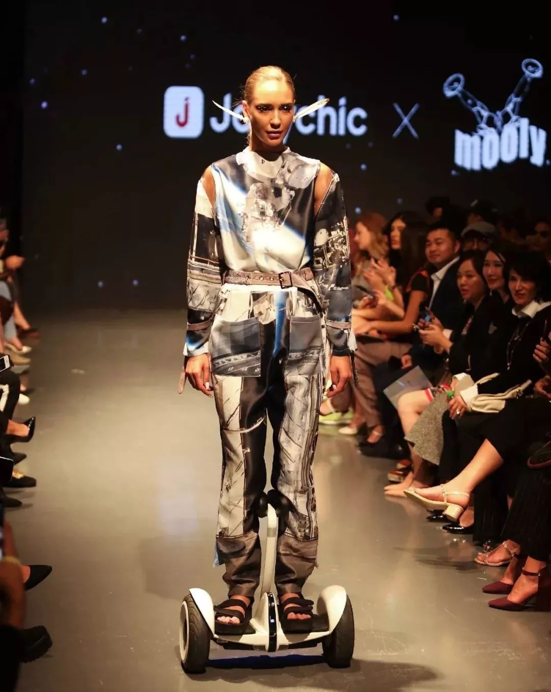 ▲身着Jollychic平台服饰的模特乘国产品牌小米平衡车出场