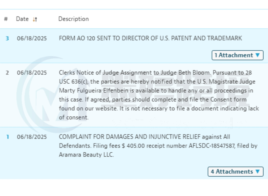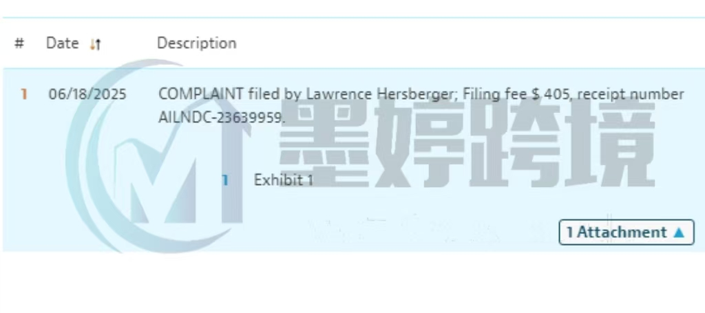 本案于2025年6月18日发起侵权诉讼,案件号:25-cv-022763,原告尚未申请TRO禁令(Temporary Restraining Order,临时限制令)的动议。