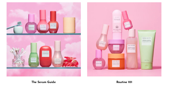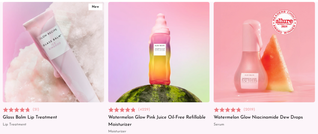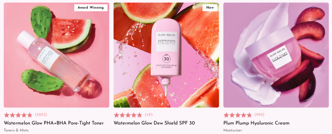 Glow Recipe 凭借其高颜值包装与清新水果气息,在年轻消费者中建立强烈辨识度。代表性产品如西瓜水润面霜、蓝莓洁面与烟酰胺露珠精华,在全球多个市场广受欢迎。