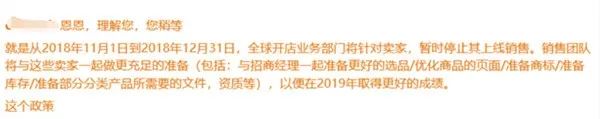 从客服回复可知,从2018年11月1日至2018年12月31日,亚马逊全球开店业务部门将针对卖家,暂时停止其线上销售。而卖家需与招商经理着手准备这五项: