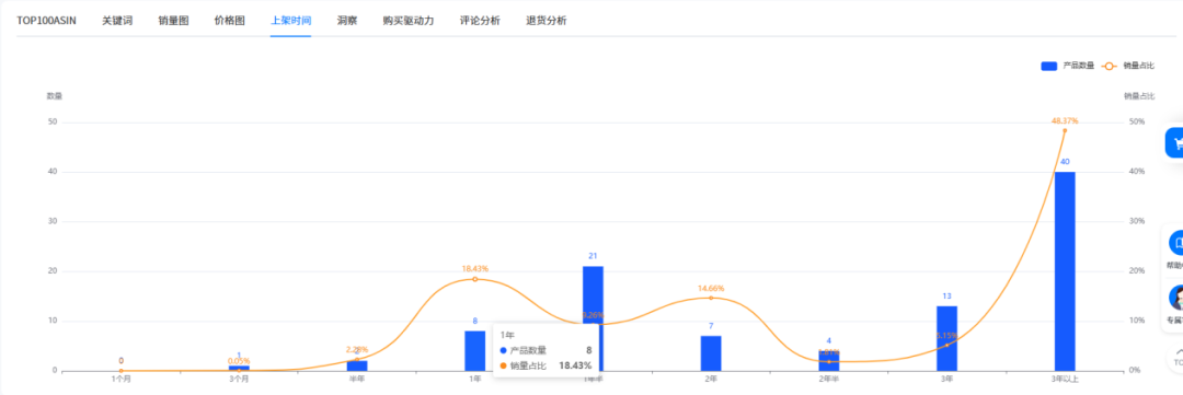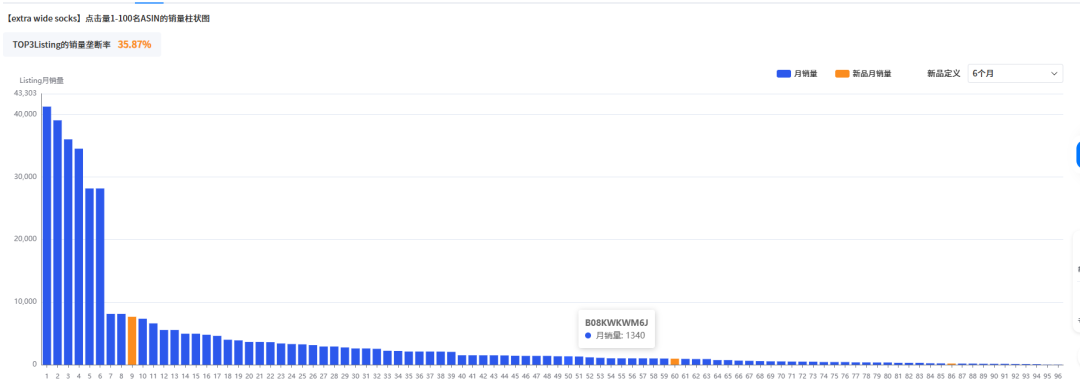 从细分市场竞争来看,尽管TOP3listing的销量垄断率达到了35.87%,但中位的listing也能做到月销1300+,1年以内的新品份额也占到了市场的20.76%;