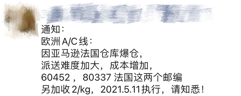 最近,有货代发出通知称:因为亚马逊法国仓库爆仓了,派送难度加大成本增加,60452、80337 法国这两个邮编,另加收2元/kg,2021年5月11日执行,请知悉!