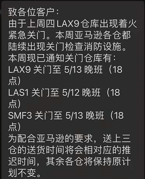 另外,小编接到的最新消息,由于上周四美国亚马逊LAX9仓库出现着火紧急关门。本周亚马逊隔仓开始陆续出现关门检查消防设施的动作。