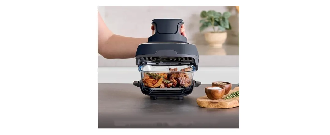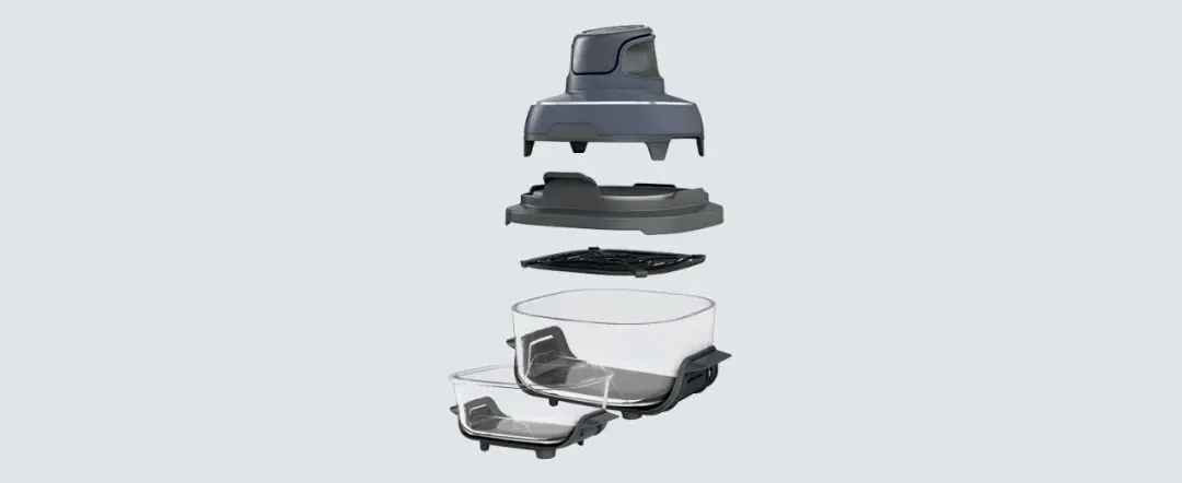 一体成型设计,拥有顶部开口、封闭底部,内部设有容纳腔(用于放置食材)。 锅体顶部开口可与烹饪主机适配,当烹饪主机盖住开口后,其产生的热风能通过顶部开口吹入容纳腔,实现食材加热。