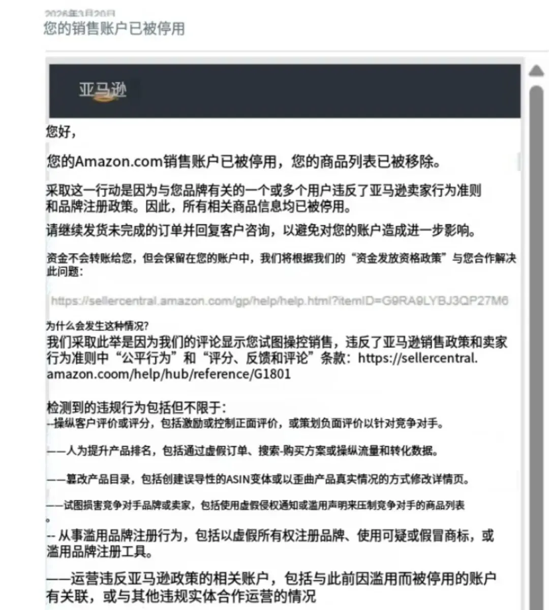 3月初,大批卖家陆续收到账号停用通知,封禁理由统一指向操纵评论、虚假刷单、滥用品牌权限。据行业内部信息,本轮封号是亚马逊跨部门协作、人工复核定性的专项行动——区别于以往的机器扫号,这次全部是人工审核,由L7级经理同意并授权。违规账号被明确关联到WOOT渠道操作,属于精准打击,几乎没有缓冲余地。