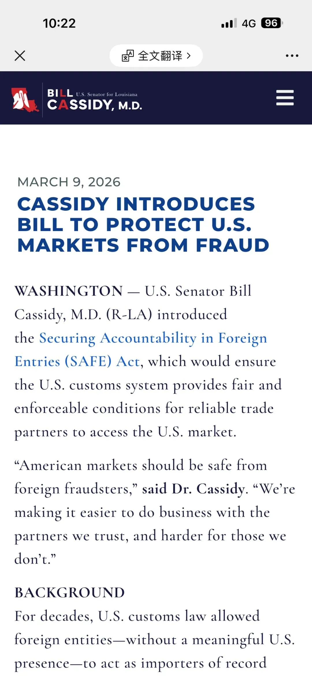 WASHINGTON — U.S. Senator Bill Cassidy, M.D. (R-LA) introduced the Securing Accountability in Foreign Entries (SAFE) Act, which would ensure the U.S. customs system provides fair and enforceable conditions for reliable trade partners to access the U.S. market.