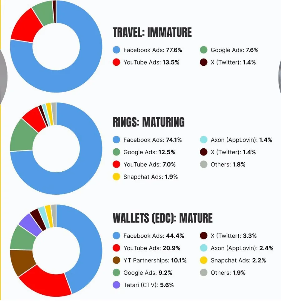 Ridge作为年营收接近2亿美金的DTC品牌,大家可以看看他们去年Q3的营销渠道花费,不同的产品线花费不一样,但是基本上主要的花费Meta广告都接近了80%,跨境千万级别的独立站,情况很多也是类似。