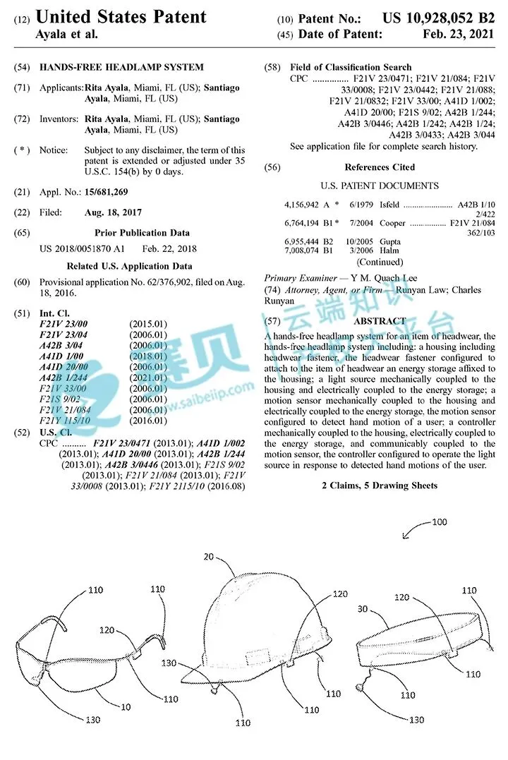该专利保护的免提头灯系统,包含储能器、光源、运动传感器和控制器等部件,且运动传感器与控制器不在一个壳体中。其核心创新点在于采用先进的运动激活技术,集成红外传感器,无需物理接触,通过检测手或其他身体部位的运动,就能便捷地打开或关闭灯光,有效避免污染护目镜和手套,降低疾病传播风险,同时提升工作效率。该头灯可固定在头饰上,配备 LED 灯作为光源,储能器、运动传感器和控制器布局合理,与外壳紧密耦合,适用于多种复杂场景。专利号:US10928052B2(美国发明专利),专利名称:Hands-free headlamp system(免提前照灯系统)