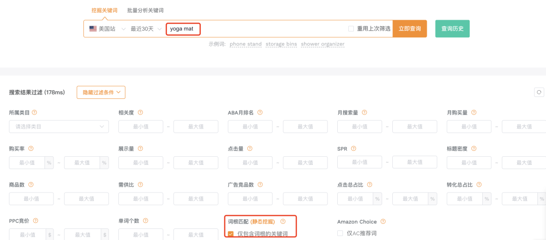 在关键词挖掘页面输入 “yoga mat”,勾选 “词根匹配”(即静态挖掘),系统自动拓展出所有包含 “yoga mat” 词根的关键词(如 “yoga mat thick”“large yoga mat”“yoga mat bag”)。