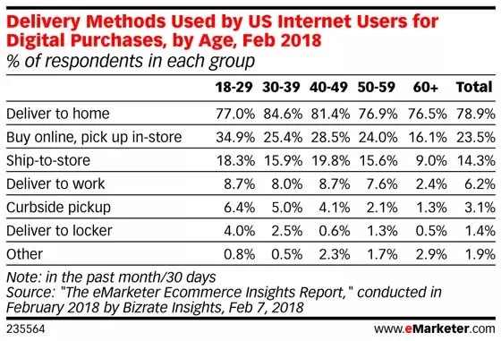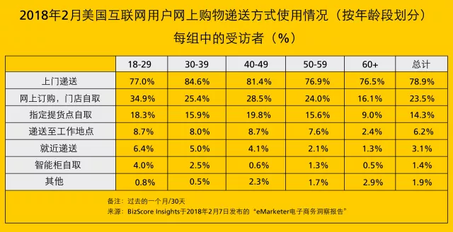 消费者在购买时有很多递送选择,但递送至家中是核心选择。 根据BizScore Insights于2018年2月发布的“eMarketer电子商务洞察报告”,大多数受访的美国成年互联网用户表示,他们更希望网上购买的商品能够递送到他们的家中 ——尽管千禧一代比上一辈人更倾向于尝试更多非传统方法, 比如把商品送至智能柜。 受访者是由Bizrate Insights公司的消费者反应研究小组Bizrate Rewards的成员组成,有超过190万的小组成员根据他们的经验和意见提供反馈。 这项由Bizrate Insights代表eMarketer提供的调查提供了每月消费者网上购物行为及目的的洞悉。 总体来说,受访者 无论年龄大小 都更加倾向于送货上门。在接受调查的受访者中,有78.9%的人表示他们网上购买时会特别倾向于选择送货上门这种递送方式。 Bizrate Insights公司总裁Scott Macon表示:“作为习惯性生物,送货上门是大多数网购者的默认选择,但在所有年龄段中,40%的购物者仍在与实体店进行交互——可以到门店直接提取在该店官网上订购的商品,也可以到指定商店提取送至该地点的商品。”由于零售商采用了全渠道的模式,顾客已经对店内退货和免费送至提货点商店的选择做出了反应。 他补充说:“对零售商来说,这是一种聪明的方式,可以使得实体店购物的客流增加,购物者在实体店中浏览时可能会购买更多的商品。” 只有极少数的受访者(1.4%)表示,他们会从智能柜中提取他们在网上购买的商品,可能是因为他们不得不去别的地方取货,比在家中或者工作场所收取货物更加麻烦。 千禧一代(4.0%)比年长的受访者更有可能使用这种方式。 年龄在40岁到49岁之间以及60岁以上的受访者中,不到1%的人表示他们会使用这种方式。 这不会令人感到惊讶。 在技术发达的年代中成长起来的千禧一代更有可能尝试和信任可替代的递送方式。 他们忙碌的生活方式导致更多的就近取货服务被使用,这对年长的购物者来说是一个相对较新的概念。