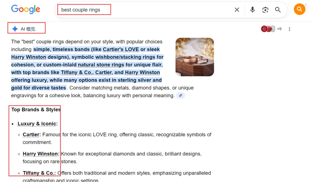 如下,我在谷歌搜索关键词“best couple rings”直接出现AI给出的答案,然后答案里面包含了一些推荐的品牌,这些品牌都是可以点击跳转到各自的独立站上面的。