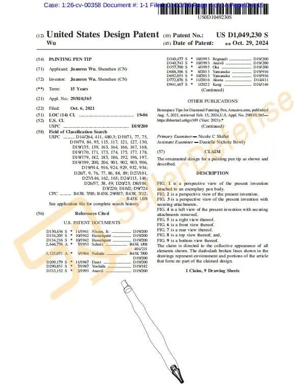 本案为国人原告,案件涉及专利产品是一款钻石画笔尖,已有多款使用原告画笔专利设计的相关产品在美国销售。相关卖家注意排查避雷!