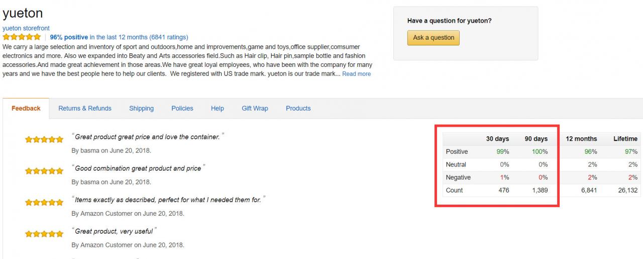 按照我之前在文章中曾经讲过的一个算法评估的方式。以美国站为例,如果店铺销量稳定,一般来说,30天Feedback数量的4-5倍大概相当于该店铺当前一天的销量,通过上图我们可以粗略的估算出来,该店铺一天的订单数量大概在2000单左右,而90天和30天Feedback数量的对比又基本上可以反馈这个店铺运营是比较平稳的。