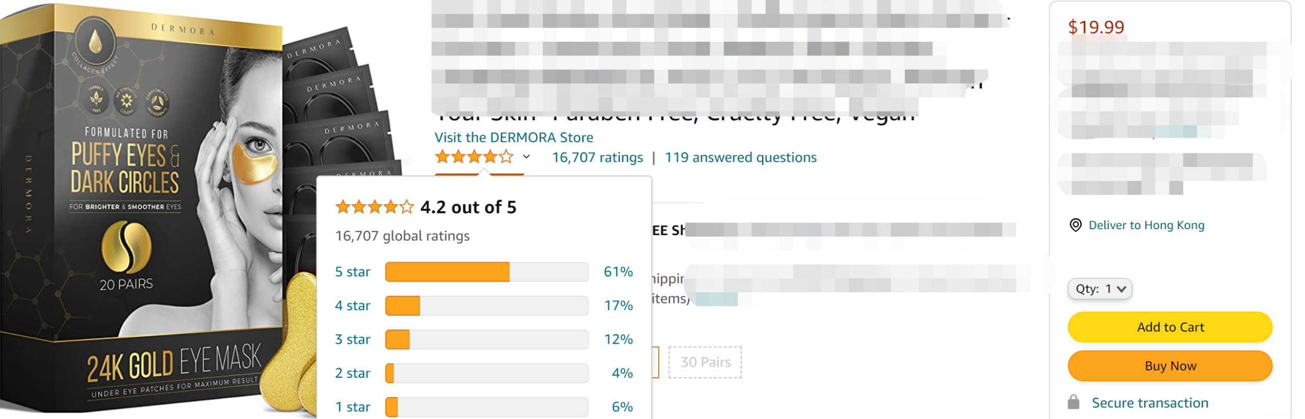 AMZ123获悉,亚马逊上一款24k金眼膜因其“立竿见影”的效果迅速大火。该眼膜在短短20分钟内可以让使用者大大缓解浮肿和眼袋,减少下垂和淡化黑眼圈。在亚马逊上该产品的评论数量达16107,其中好评数量超过了10000个,好评率为61%。大量买家纷纷给出“高效”“易于使用”等称赞词。