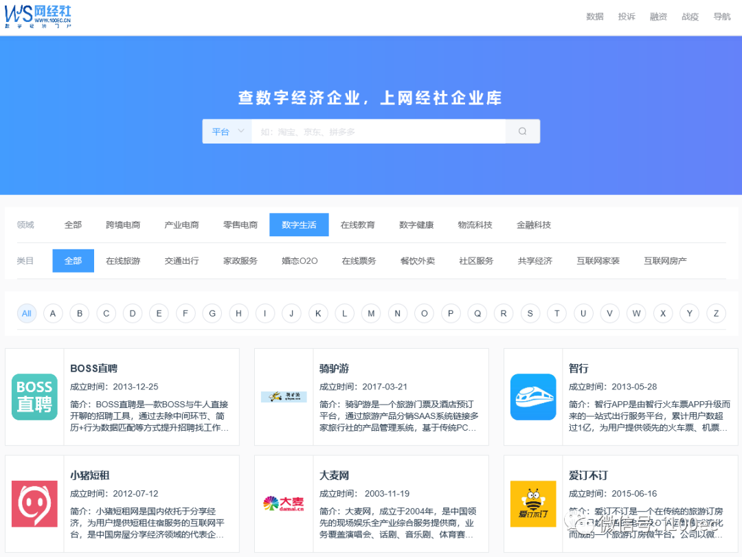 数据板块涵盖数字生活的行业整体数据、融资数据、评级数据等。