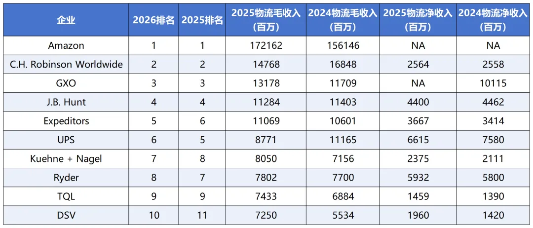 物流业权威杂志《Transport Topics》公布了2026年北美第三方物流企业100强、全球空运货代50强、全球海运货代50强等物流行业相关榜单排名。