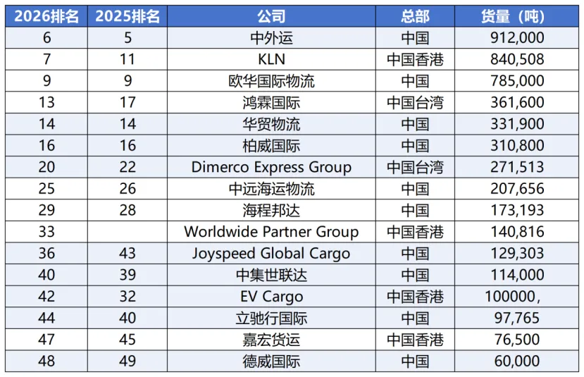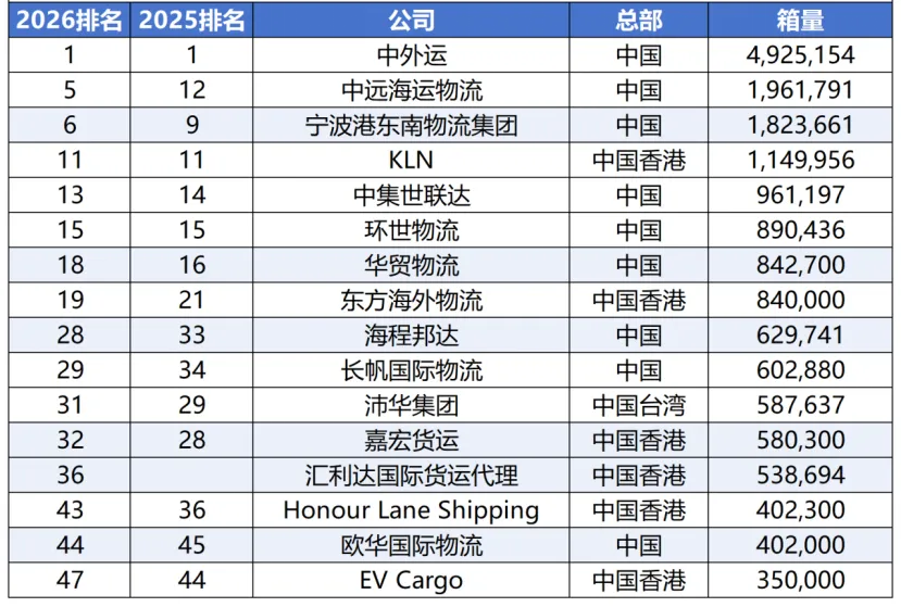 2026全球空运、海运货代50强公布!中外运蝉联海运货代榜首!