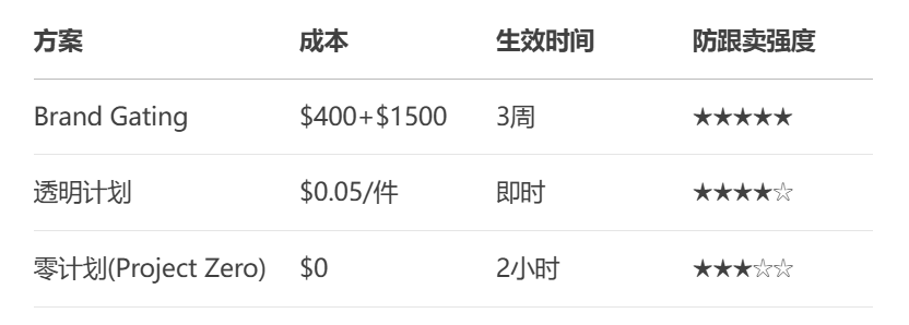 建议策略:先启动零计划(免费即时防护)→ 同步申请Brand Gating → 销量稳定后接入透明计划