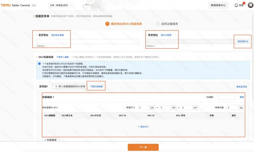 二、 填写发货地址、收货地址、SKU以及包装信息