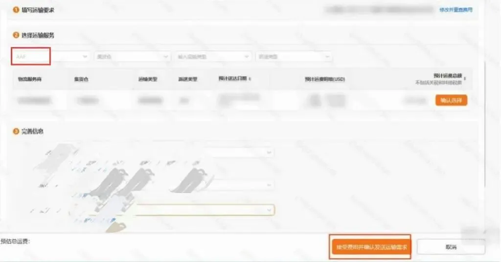 三、 选择发货模式—填写运输要求—选择美通“AAF”为运输服务商