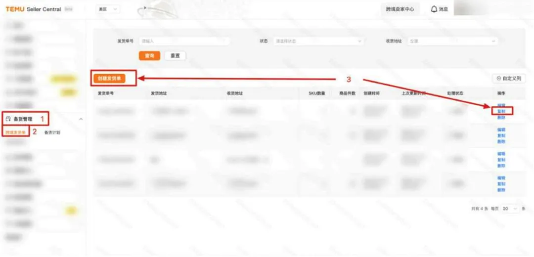 打开卖家中心,点击【备货管理】-选择【跨境发货单】,也可以点击发货单列表的右侧【复制】按钮,快速复制已经生成的发货单,修改内容并创建新发货单。