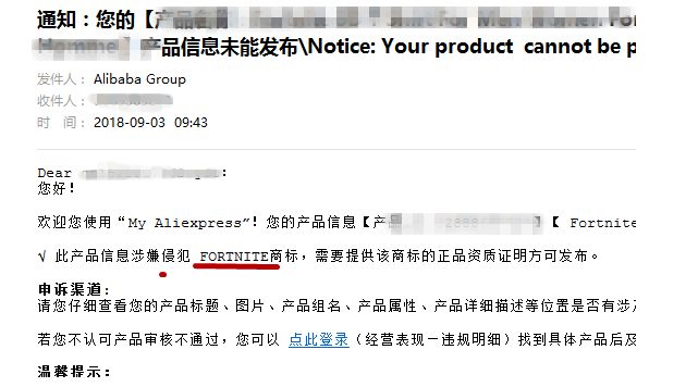 平台的邮件称,此产品信息涉嫌侵犯Fortnite商标,需要提供该商标的正品资质证明方可发布。
