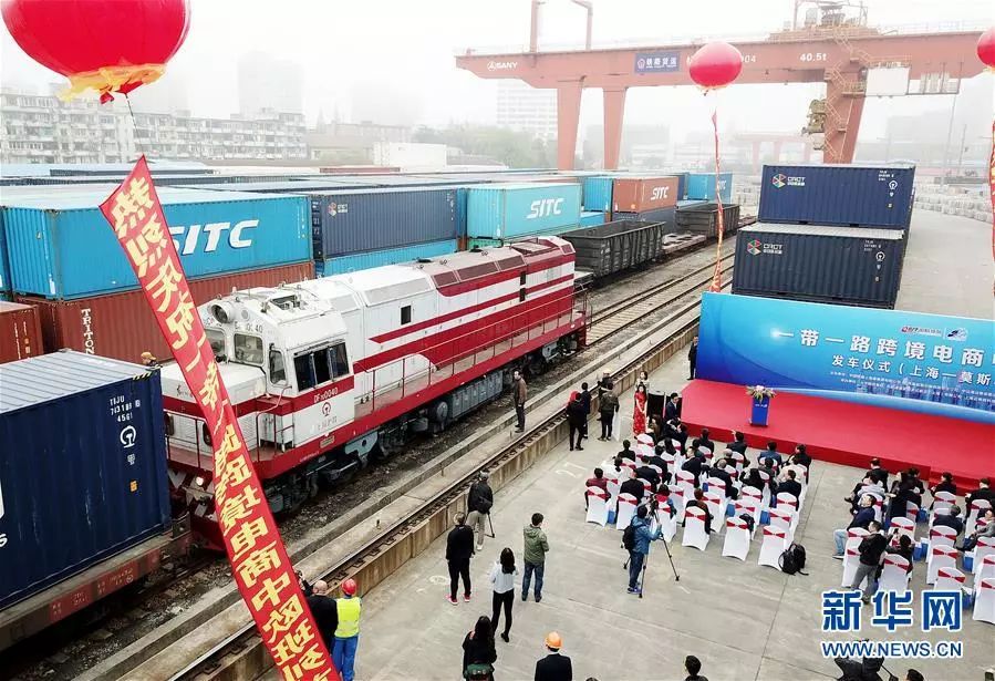3月30日,一列上海开往莫斯科的中欧班列在发车仪式上。当日,由上海开往莫斯科的一带一路跨境电商中欧班列货运列车在上海杨浦站发车,助力中欧间跨境电商物流运输。