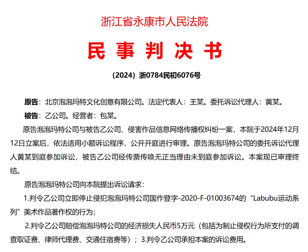 2025年6月,浙江永康市人民法院判决了一起拉布布侵权案。被告在网店销售3D打印的LABUBU玩偶,被判决赔偿1万元。利润全赔进去,还得搭上诉讼费和时间成本。