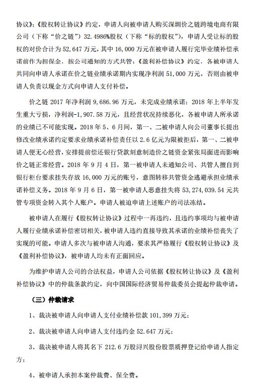 国庆7天假后的第一个工作日,浔兴股份发布公告,向被申请人购买深圳价之链跨境电商有限公司(下称“价之链”)32.4986%股权,申请人受让标的股权的对价合计为52,647万元,其中16,000万元在被申请人履行完毕业绩补偿承诺前作为担保金,按公司通知的方式共管;《盈利补偿协议》约定,各被申请人共同向申请人承诺在价之链业绩承诺期内实现净利润51,000万元,否则由被申请人负责以现金方式向申请人支付补偿。