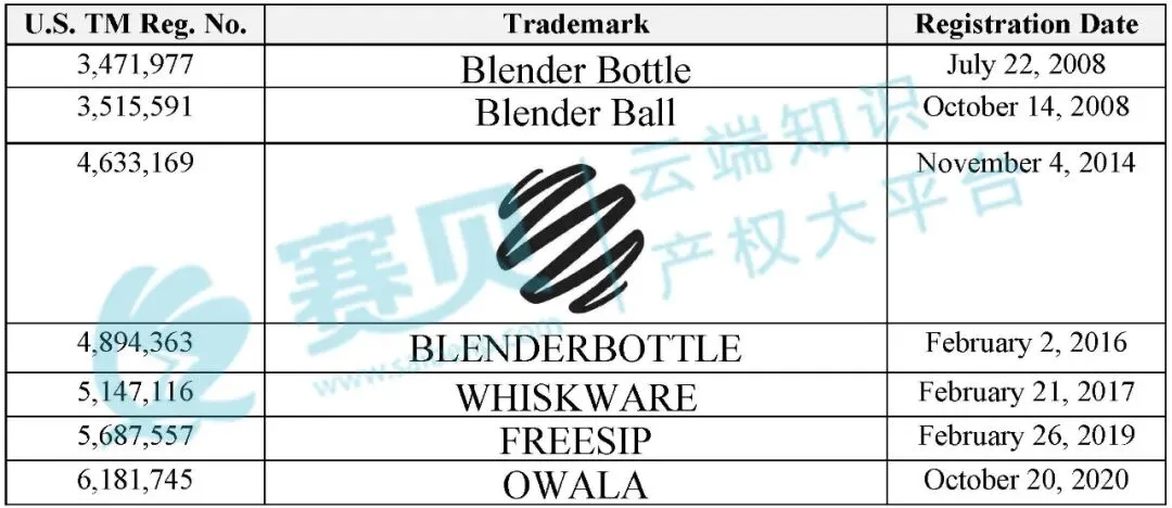 此次TRO维权商标包括Blender Bottle、Blender Ball、BLENDERBOTTLE、WHISKWARE、FREESIP、OWALA、螺旋球图形等7大商标,保护范围覆盖了家用容器、搅拌器、饮料容器用饮水嘴、保温杯、空水瓶、摇摇杯、饮料容器及清洁刷等。