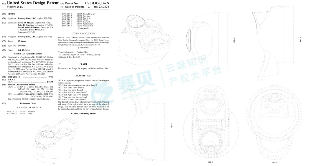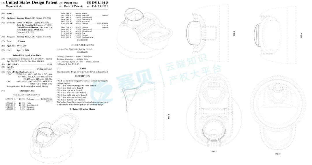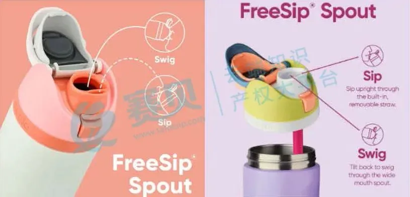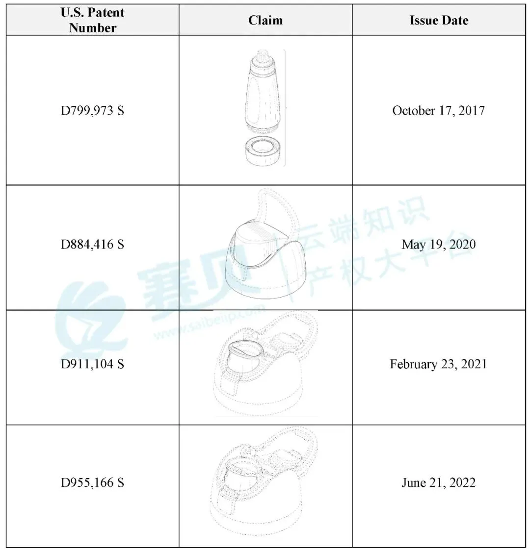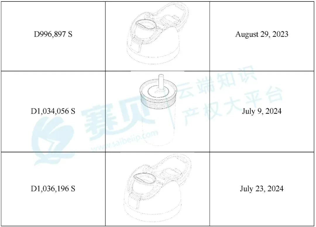 原告此次维权的外观专利聚焦产品核心部件,其中容器整体外观由 2017 年授权的专利 D799,973 S 保护,容器盖子的装饰性设计分别通过2020年授权的 D884,416 S 和 2024 年授权的 D1,034,056 S提供保护,饮水嘴的不同外观造型则由 2021 年至 2024 年陆续授权的D911,104 S、D955,166 S、D996,897 S、D1,036,196 S 等专利覆盖。