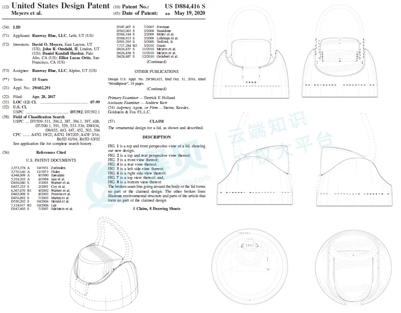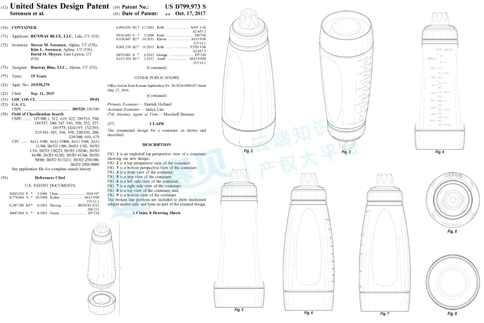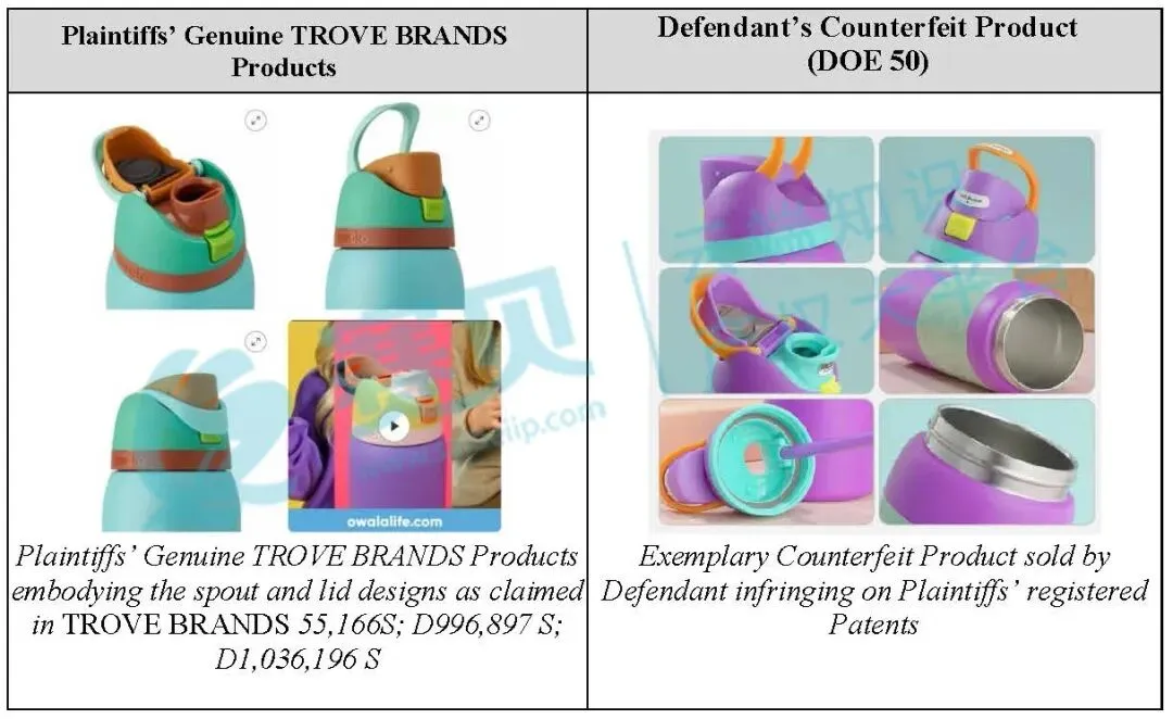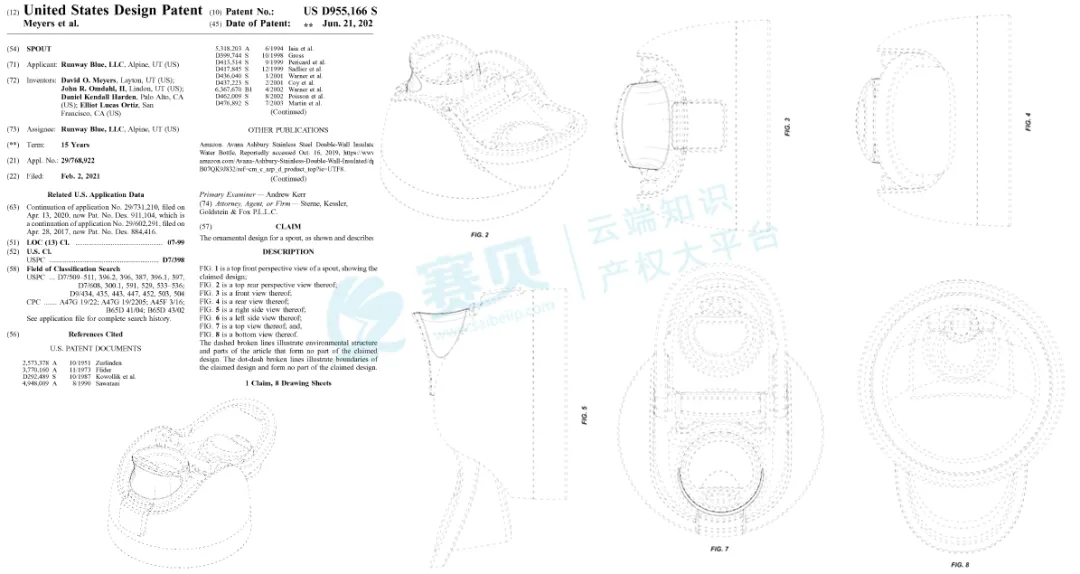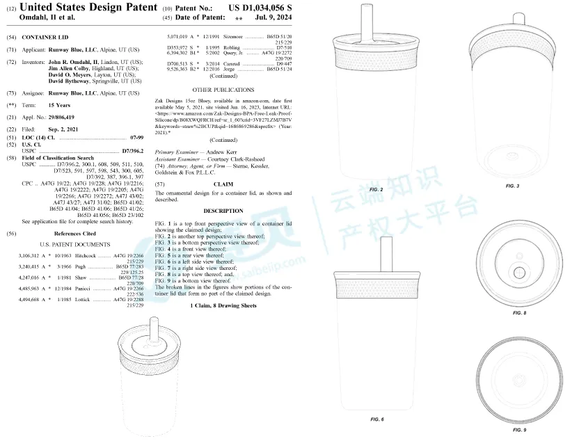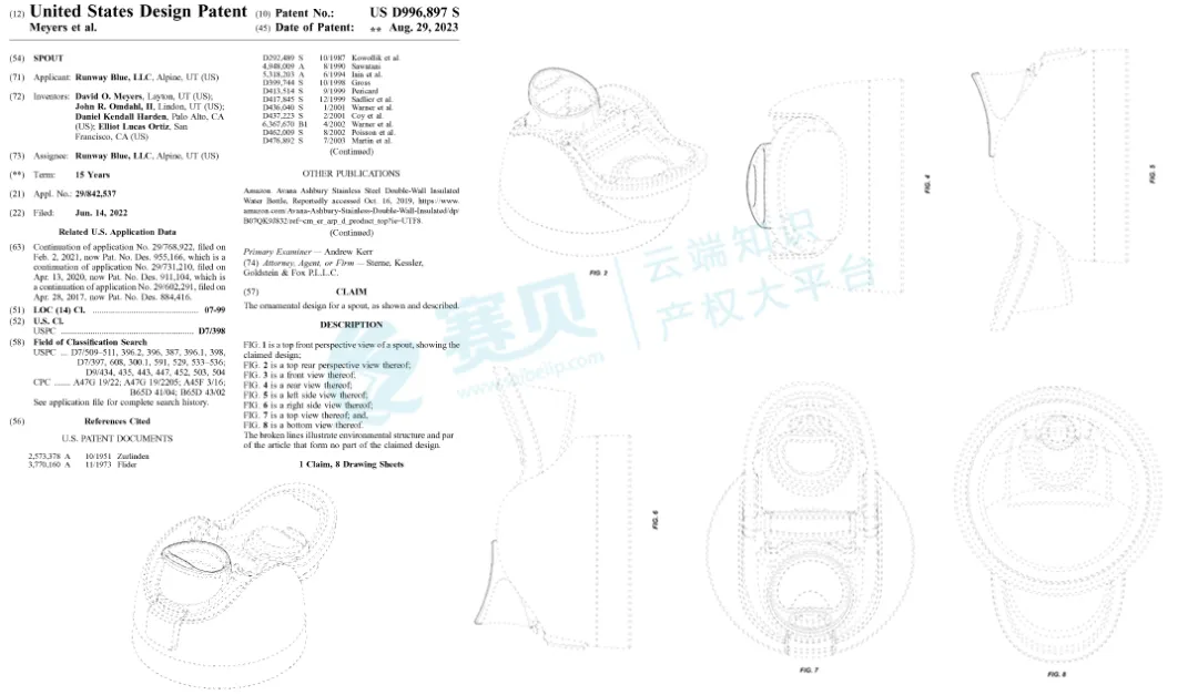 原告此次维权的外观专利聚焦产品核心部件,其中容器整体外观由 2017 年授权的专利 D799,973 S 保护,容器盖子的装饰性设计分别通过2020年授权的 D884,416 S 和 2024 年授权的 D1,034,056 S提供保护,饮水嘴的不同外观造型则由 2021 年至 2024 年陆续授权的D911,104 S、D955,166 S、D996,897 S、D1,036,196 S 等专利覆盖。