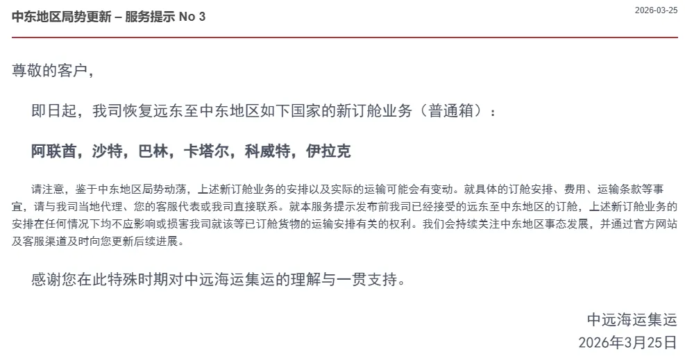 刚刚!中远海运恢复中东地区部分国家订舱